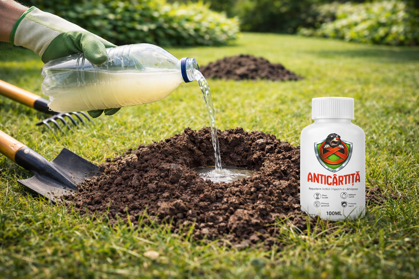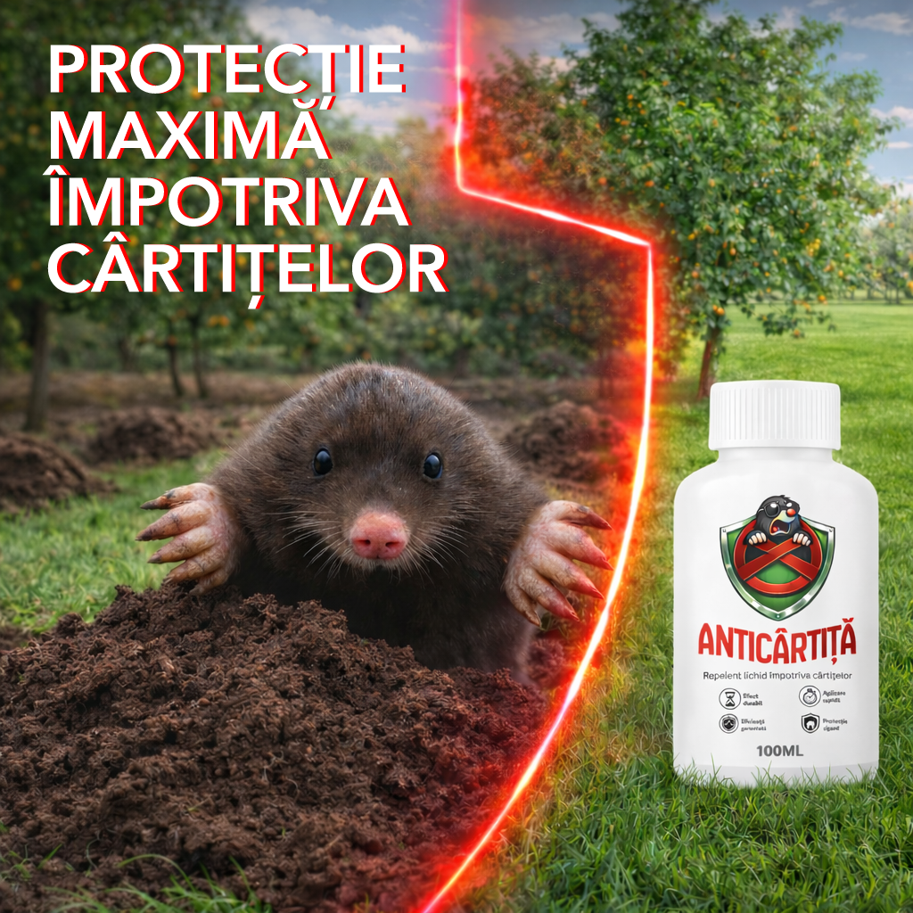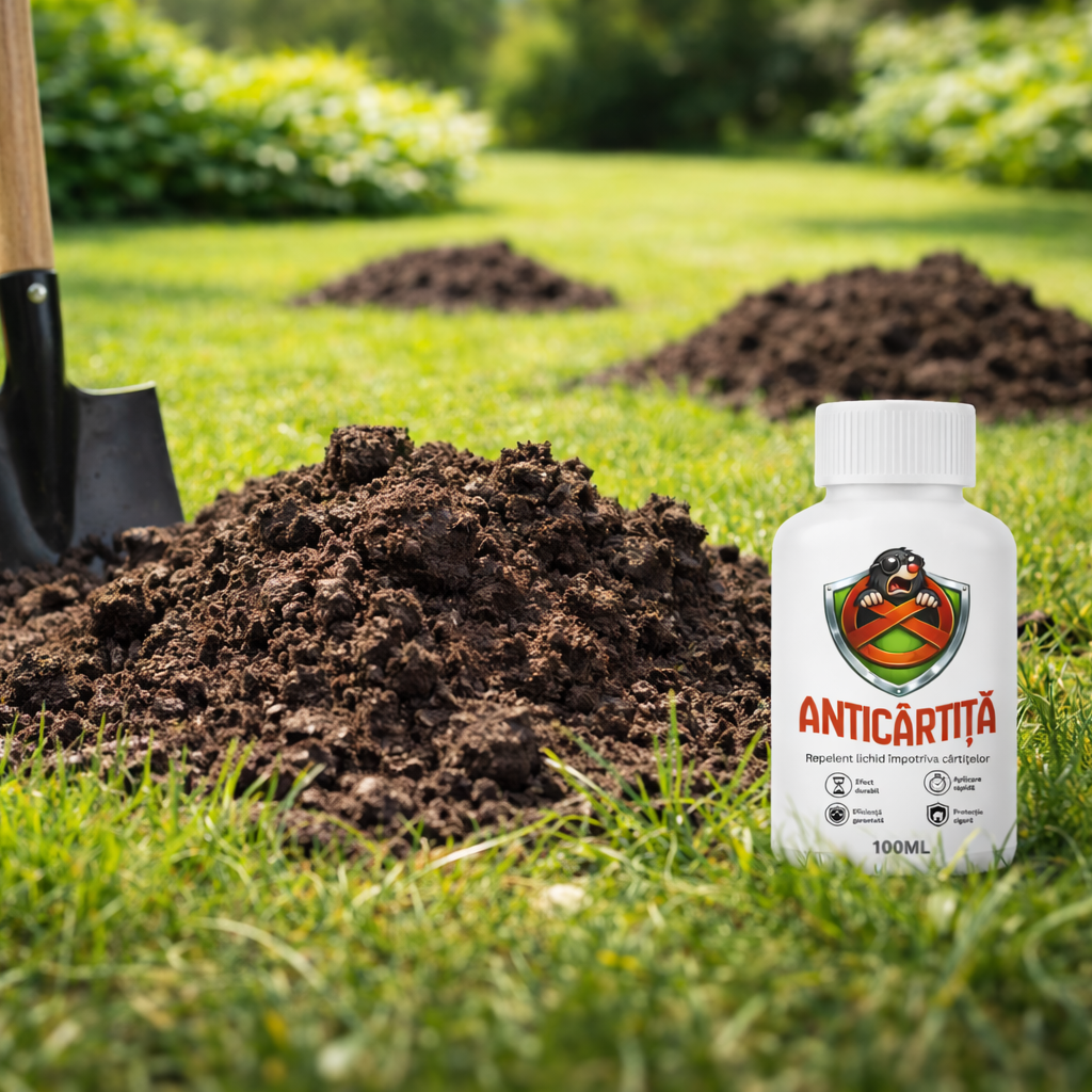 Anticârtiță este un repelent eficient, conceput special pentru a îndepărta cârtițele din grădini, peluze, livezi și spații cultivate. Formula sa acționează printr-un miros puternic, extrem de neplăcut pentru cârtițe , dar perfect tolerabil pentru oameni și animale de companie. Aplicarea regulată elimină eficient mușuroaiele și tunelurile cârtițelor.